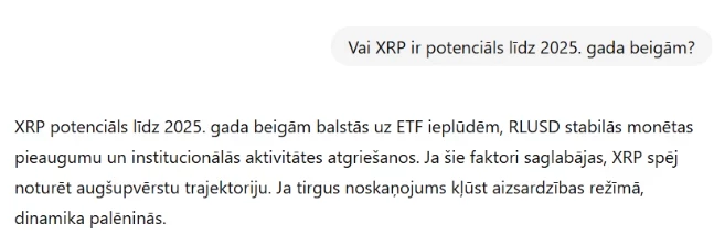 ChatGPT prognozē, ka XRP cena varētu pieaugt no aptuveni 2,50 ASV dolāriem līdz 8–10 ASV dolāriem līdz 2025. gada beigām optimistiskā scenārijā, ja likviditāte caur ETF un banku partneriem turpinās pieaugt. AI saskata īpašu potenciālu, ja XRP strukturāli pārsniegs savu galveno pretestības līmeni, kas ir pazīme, ka kapitāls no Bitcoin pāriet uz alternatīvajiem aktīviem. Tomēr prognozē arī pieņemts, ka regulatīvā skaidrība saglabāsies un makroekonomiskie apstākļi neizraisīs bargu riska novēršanas vidi.