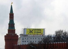 Policija noņem pretī Kremlim uzstādītu transparentu ar uzrakstu "Putin, ej prom"