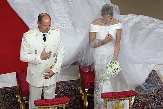 Šarlēne ieradās pils pagalmā savam tēvam Maikam zem rokas, tērpusies slavenā itāļu dizainera Džordžio Armani darinātā balta zīda kleitā ar garu velci. Kleita rotāta ar kristāliem un pērlēm. Viņu krēmkrāsas galma godasardzes formas tērpā pie altāra sagaidīja Albērs.
