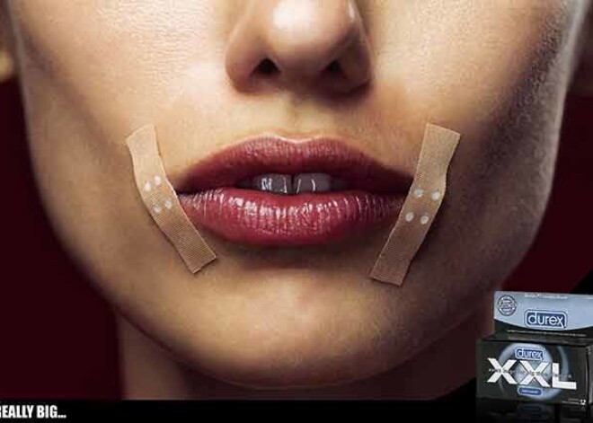 Meitene ar ieplīsušiem lūpu kaktiņiem reklamē jaunos, 24.13 centimetrus (9.5collas) garos prezervatīvus, kas paredzēti sevišķi lielu locekļu īpašniekiem, vai arī tiem, kas vēlas atstāt iespaidu uz veikala kasierēm.
