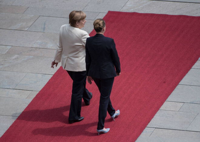 Himnas laikā vizītē Dānijā Angela Merkele nu jau sēž, nevis stāv
