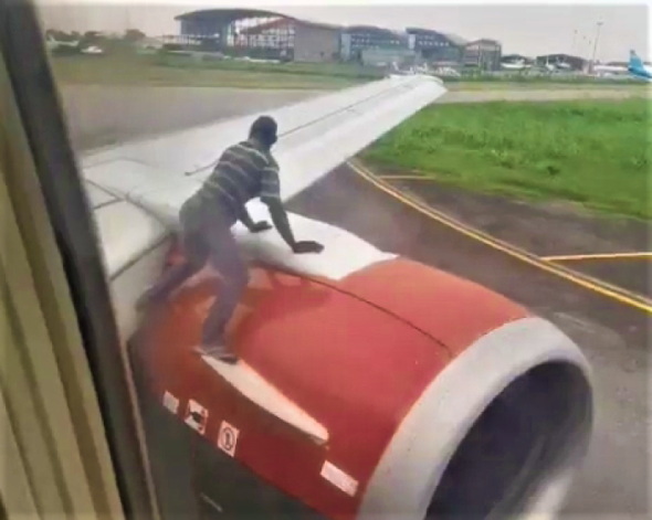 Kāds lidmašīnas pasažieris Nigērijas Lagosas lidostā nofilmējis brīdi, kad neilgi pirms pacelšanās uz lidmašīnas spārna uzlecis kāds vīrietis, kurš pamanījies ielīst arī lidaparāta dzinējā, ziņo "CNN".