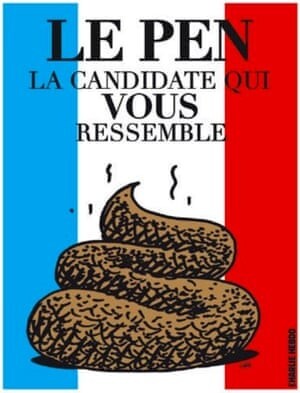 Karikatūrā, kas "Charlie Hebdo" tika publicēta 2012.gadā, redzama kūpoša izkārnījumu kaudze, virs kuras lasāms uzraksts: "Lepēna. Kandidāte, kura ir kā jūs." Lepēna iesūdzēja tiesā televīzijas programmas vadītāju Lorānu Rikjē kurš televīzijā nodemonstrēja šo karikatūru reizē ar citām karikatūrām par pārējiem prezidenta amata kandidātiem.
