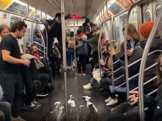 Šajā brīdī daļa pasažieru bailēs metas bēgt, kamēr citi, saprotot, ka puiši pajokoši, smejas. Viens no video autoriem vietnei "Insider" pastāstījis, ka kāda sieviete ar bērnu, kura sēdējusi viņam blakus, smējusies jau kopš brīža, kad abi iekāpuši metro, tomēr daļu cilvēku viņiem nācies nomierināt, pastāstot, ka viņi tikuši izjokoti.