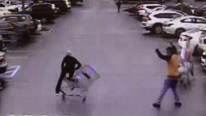 Novērošanas kameras ierakstā redzams, kā policists cenšas noķert bēgošu zagli. Pamanījis notiekošo, kāds autostāvvietā iepirkumu ratiņus stumjošs vīrietis nolēmis sagaidīt īsto brīdi, lai iztraucētu zagļa skrējienu - viņam pietuvojoties, nejaušais pircējs ar slaidu loku uzstūmis zaglim tieši virsū ratiņus.
