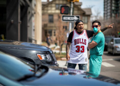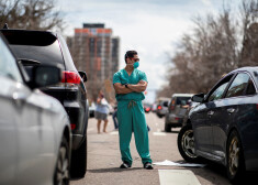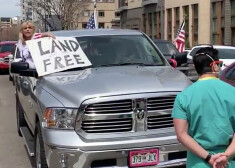 Protesta akcija Kolorādo statā ASV, kur cilvēki iebilst pret ierobežojumiem, kas ieviesti vīrusa dēļ, bet mediķi stājas pretī distancēšanās noteikumu ...