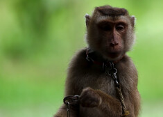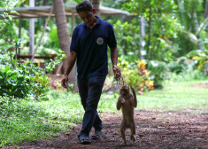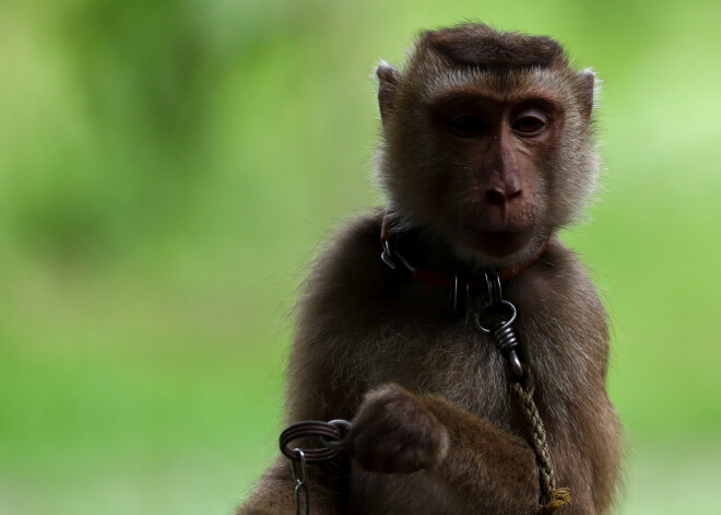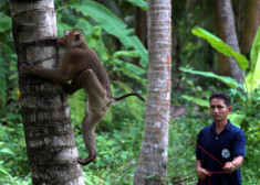 Kā Taizemē pērtiķus māca novākt no palmām kokosriekstus