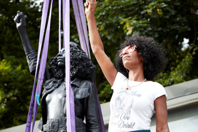 Aizvākta nelegāli uzstādītā "Melnādaino dzīvībām ir nozīme" aktīvistes skulptūra