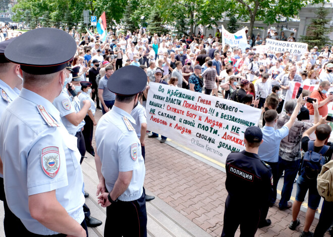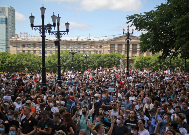 Protesta akcijas Habarovskā nerimst kopš 9.jūlija, taču šajā sestdienā līdztekus prasībām par Furgala atbrīvošanu apmēram 8000 ielās izgājušie cilvēki pieprasīja arī Krievijas prezidenta Vladimira Putina tiesāšanu.