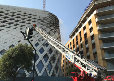 Ugunsdzēsēji dzēš liesmas Zahas Hadīdas projektētajā ēkā.