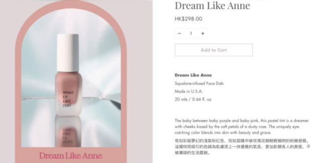 Viens no produktiem - šķidrā vaigu sārtuma tūbiņa - pārdots zem nosaukuma "Sapņo kā Anna", atsaucoties uz Annu Franku. Produkta cena ir 298 Honkongas dolāri jeb aptuveni 32 eiro, un tās aprakstā teikts, ka "šis pasteļtonis ir sapņotājs ar vaigiem, kurus noskūpsta putekļainās rozes maigās ziedlapiņas". Unikālā, acis piesaistošā krāsa saplūst ar ādu skaistuma un grācijas pavadībā, teikts produkta aprakstā.