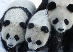 Dvīņu pandas Beļģijas zoodārzā bauda savu pirmo sniegu
