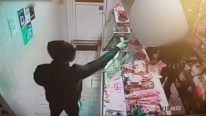 VIDEO: drosmīga pārdevēja Mažeiķos stājas pretī uzbrucējam, kurš draud ar sarūsējušu pistoli