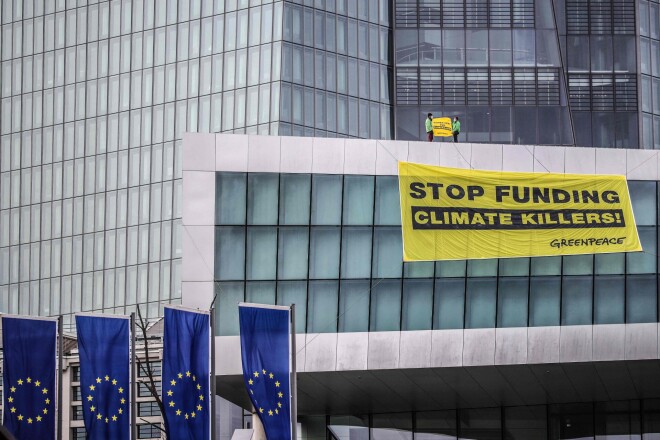 Pēc nosēšanās uz ECB galvenās mītnes pieņemšanas ēkas jumta aktīvisti atritināja 12 metru garu plakātu, uz kura lasāms: "Apturiet klimata slepkavu finansēšanu".