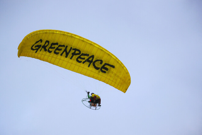 Vides aizstāvju organizācijas "Greenpeace" aktīvisti, izmantojot motorizētu paraplanieri, trešdien nolaidušies uz Eiropas Centrālās bankas (ECB) ēkas jumta, lai tādējādi protestētu pret ECB monetāro politiku, kas, viņuprāt, dod priekšroku nozarēm, kuras stipri piesārņo vidi.