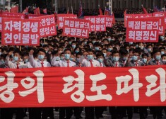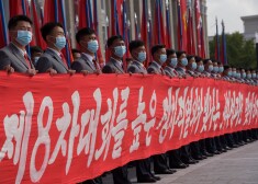 Ziemeļkorejieši mītiņā redzami ar maskām uz sejas