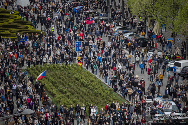 Ievērojot sociālo distancēšanos, protestētāji pauda sašutumu, ka Zemana politika grūž Čehiju Maskavas rokās.