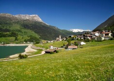 Pasakainie skati pie Resijas ezera Itālijas kalnos