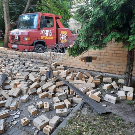 Latvijas vēstniecībā Minskā cauri sienai iztriecas auto evakuators