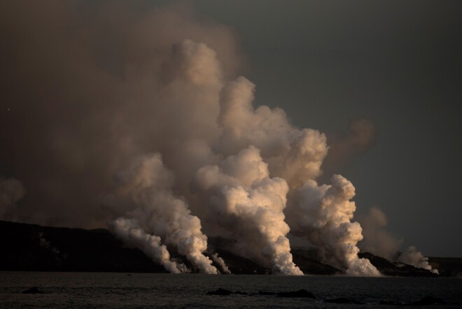 Lavas kontaktā ar sālsūdeni radušies melni dūmi.