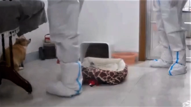 Video, kas publicēts Ķīnā populārajā sociālajā vietnē "Weibo", redzams, kā suns mierīgi guļ savā guļvietā, līdz pēkšņi istabā ienāk divi aizsargtērpos ģērbušies cilvēki. Vienam rokās ir kas līdzīgs lauznim, bet otram - dzeltens maiss.