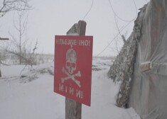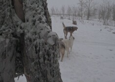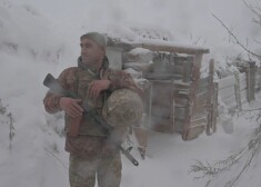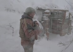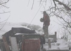 Ukraiņu karavīrs Krimskes ciemā raugās pāri tranšejai, kamēr uz apkārtējiem laukiem krīt biezas sniega pārslas. Cits stāv tranšejas iekšpusē iepretim ...