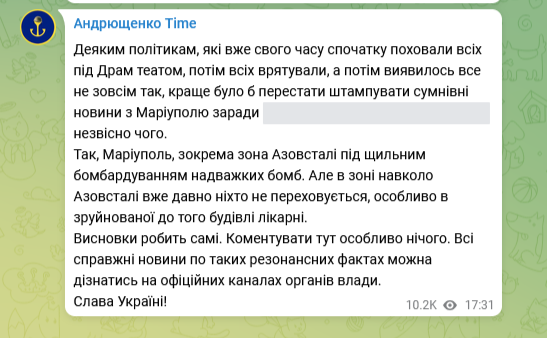 Tikmēr Andrjuščenko "Telegram" noliedza ziņas, ka cilvēki slēpušies slimnīcā netālu no "Azovstaļ" rūpnīcas: "Neviens ilgāku laiku tur nav slēpies, it īpaši iepriekš nopostītajā slimnīcas ēkā," viņš rakstīja "Telegram".