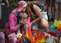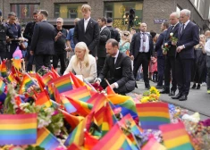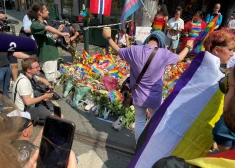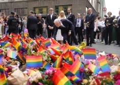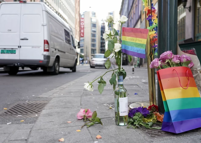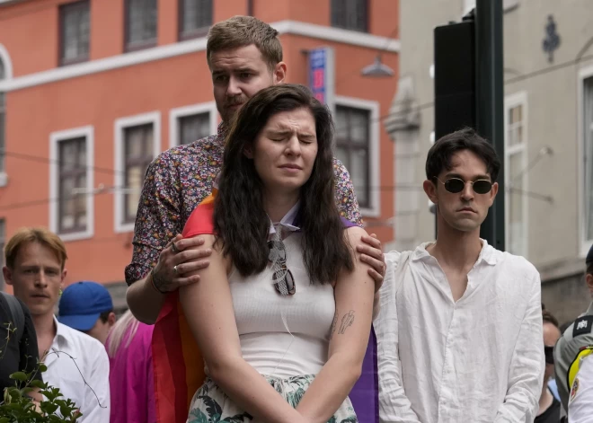 Cilvēki sēro pēc traģiskās apšaudes pie populāra geju kluba Oslo centrā 2022. gada 25. jūnijā. Naktī no piektdienas uz sestdienu tika nogalināti divi cilvēki, 21 cilvēks ievainots, 10 cietušo stāvoklis ir nopietns.