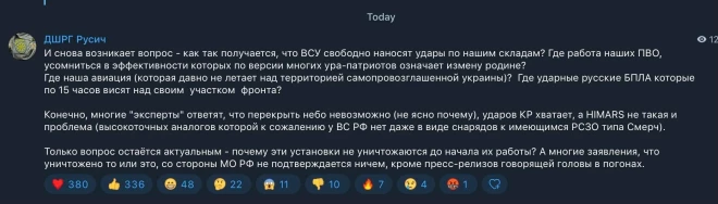 Formējuma "Telegram" kontā pausta atklāta kritika Krievijas bruņoto spēku aviācijai un pretgaisa aizsardzībai, pie viena vēl pasmejoties par tiem, kuri akli tic šo Krievijas spēku varenībai Ukrainas konfliktā.