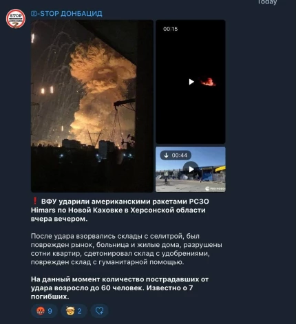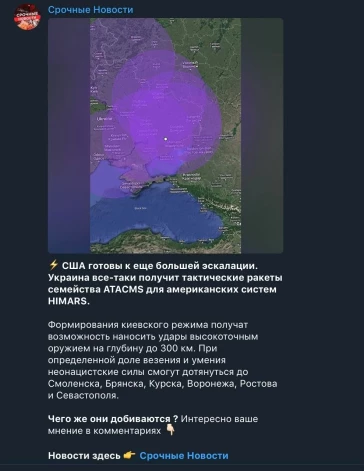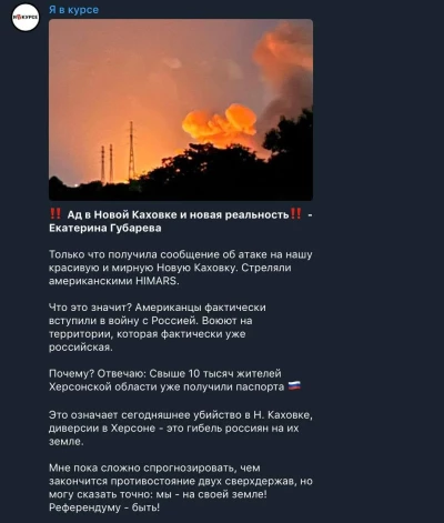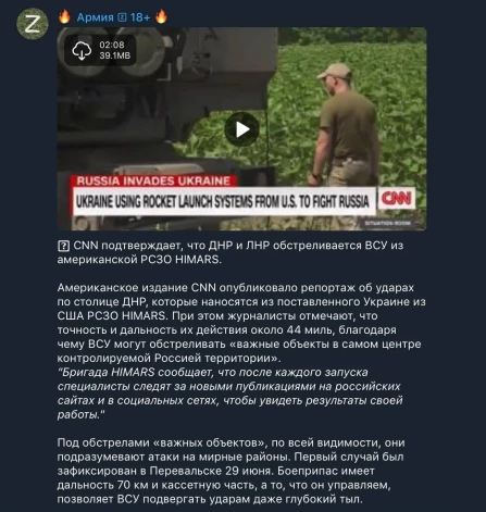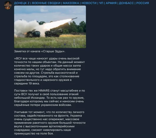 Kādā no ierakstiem, ko plaši pārpublicē līdzīgi kanāli, okupantu atbalstītāji norāda, ka faktiski jau notiekot "karš starp Krieviju un ASV", jo ar HIMARS tiek "šauts pa faktiski Krievijas kontrolē esošu teritoriju":