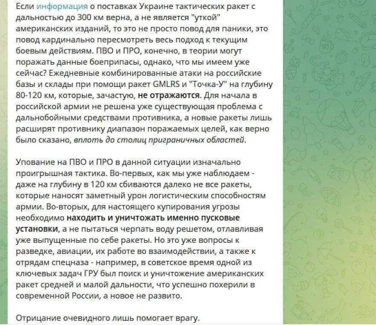 Šajā ierakstā "specoperācijas" fani īpaši pārdzīvo par to, ka ukraiņi tik tiešām no ASV saņems tālas darbības raķetes, kuras spēj aizsniegt arī virkni Krievijas pierobežas pilsētu un nodemonstrēt turienes iedzīvotājiem, ko patiesībā nozīmē viņu valsts uzsāktā "specoperācija":