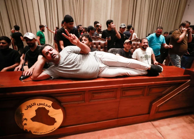 Irākas parlamenta ēkā, kas atrodas Bagdādes pastiprināti apsargātajā Zaļajā zonā, trešdien iebruka ietekmīgā šiītu garīdznieka Muktadas al Sadra atbalstītāji, protestējot ...