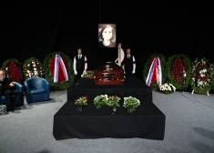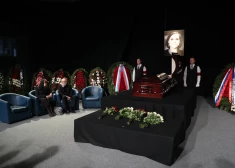 Aiz atvērtā zārka karājās melnbalts 30 gadu vecumā bojā gājušās Duginas portrets.