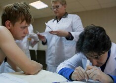 Jauniesaucamie krievijas jaunieši iziet medicīnisko pārbaudi Ivanovas rekrutēšanas centrā.