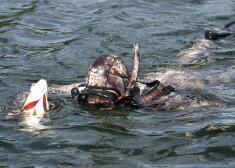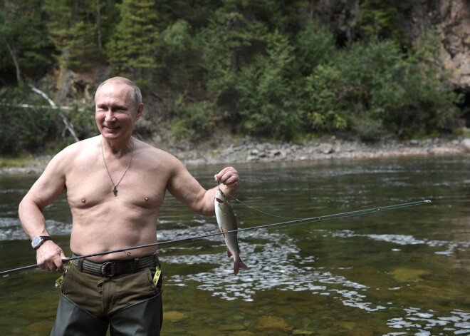 Vladimirs Putins ar pliku torsu pozē ar zivīm