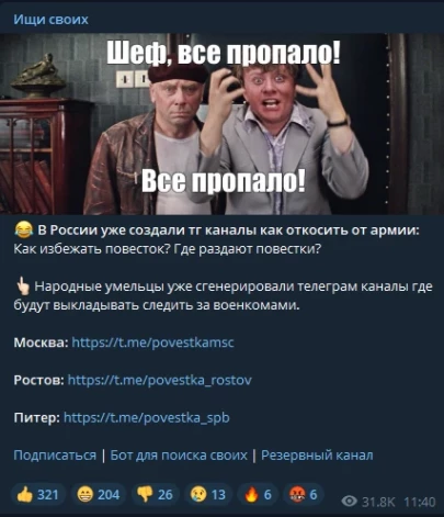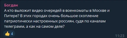 “Kurš ieliks video ar rindām pie kara komisariātiem Maskavā un Sanktpēterburgā? Šajās pilsētās ir ļoti daudz patriotiski noskaņotu krievu, vismaz spriežot pēc “Telegram” kanāliem. Kā ir patiesībā?” joko kādā citā “Telegram” grupā: