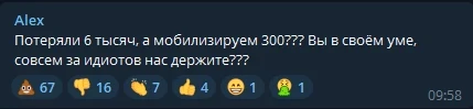 “Pazaudējām 6000, bet mobilizēsim 300 000??? Jūs pie prāta esat, galīgi mūs par idiotiem uzskatāt???” raksta kāds no lietotājiem: