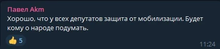 Kāds tikmēr joko: “Labi, ka visiem deputātiem ir aizsardzība pret mobilizāciju. Būs mums ļaudis uz vietas, kuri par tautu varēs domāt.”: