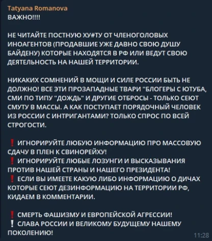 Domājams, redzot nevienprātību diskusijās, virkne Kremļa propagandu izplatošo “Telegram” kanālu sāka tajās publicēt identisku paziņojumu, kurā rupjiem vārdiem un lieliem burtiem uzsvērts, ka “nevajag lasīt ārvalstu aģentu murgus”.