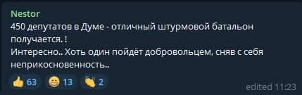 “450 deputātu valsts domē – lielisks bataljons sanāk! Interesanti... vai kaut viens aizies kā brīvprātīgais, neizmantojot savu neaizskaramību?” retoriski vaicā kāds lietotājs: