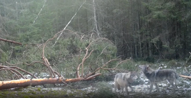 Ar slepeno kameru nofilmēti unikāli kadri - kā Lietuvas mežā pastaigājas skaista vilku ģimene