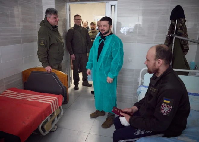 Zelenskis arī apmeklēja ievainotos Ukrainas karavīrus slimnīcā, kur pasniedza apbalvojumus par valsts aizstāvību.