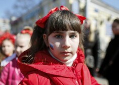Kā redzams attēlos no Krimas pirmdien, Krievijas simbolika – karogs – bija gan uz bērnu vaigiem uztriepts, gan sašūts milzīgā ...