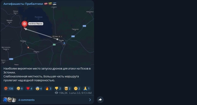 Pamatā "antifašisti" piedāvā divas "ticamākās" vietas, no kurām sūtīts dronu mākonis - Liepna, netālu no Alūksnes, vai arī Igaunijas lielciems Verska.