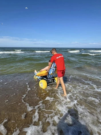 Pludmales glābēji "BĮ Klaipėdos paplūdimiai" publiskojuši fotogrāfijas, kurās redzams, kā pirmais atpūtnieks izmanto īpaši pielāgoto peldēšanās ratiņkrēslu. Aiz viņa stāvošais glābējs vīrieti pavadīja uz pirmo peldi jūrā. “Esam priecīgi, ka varam dot savu ieguldījumu sapņa īstenošanā – atpūtnieks pirmo reizi peldējās jūrā! Šis peldēšanās ratiņkrēsls ir palīgierīce cilvēkiem ar kustību traucējumiem. Ar šo ratiņkrēslu asistenta pavadībā cilvēki ar īpašām vajadzībām var droši peldēties jūrā," sociālajos tīklos dalījās pludmales glābēji, norādot, ka šo jauninājumu var izmantot divas pludmalēs - Antrosios Melnragės Neįgaliųjų pludmalē un Smiltynės pludmalē Klaipēdā.