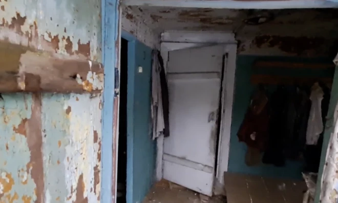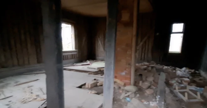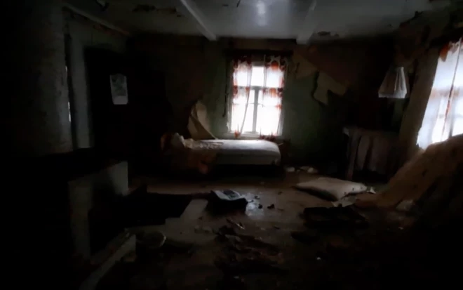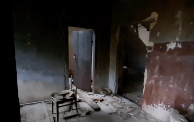 Dzīvojamā istabā ar nobrukušām tapetēm un nolupušiem griestiem ir izmētātas mantas, pagraba lūka ir vaļā, un viss skats liecina, ka nepiederoši cilvēki rūpīgi izmeklējuši šo vietu un varbūt pat kaut ko paņēmuši līdzi.