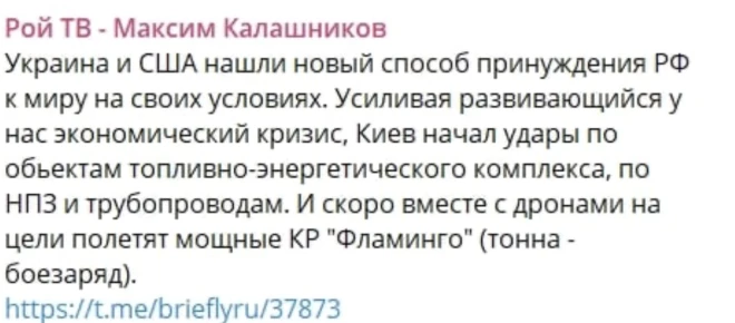 "Ukraina un ASV ir atradušas jaunu veidu, kā piespiest Krieviju uz mieru ar saviem noteikumiem. Saasinot ekonomisko krīzi, Kijiva ir sākusi triecienus degvielas un enerģētikas objektiem, un drīz kopā ar droniem mērķus sasniegs arī jaudīgās spārnotās raķetes "Flamingo"," paziņoja satrauktais Z-patriots.