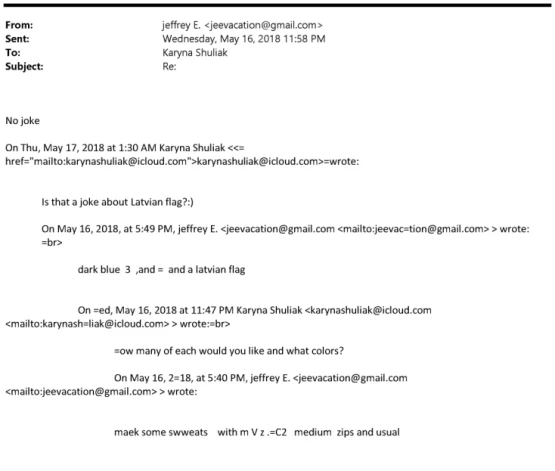 Konkrētā sarakste notikusi starp Epstīnu (jeevacation @ gmail.com) un Karīnu Šuljaku (karynashuliak @ icloud.com) – baltkrievieti, kuru finansists pazinis vismaz kopš 2012. gada.