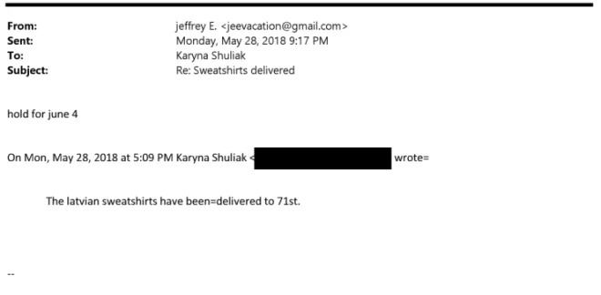 Tā gada 16. maijā Epstīns, sev ierastā manierē ar daudzām kļūdām, Šuljakai raksta: “maek some swweats with m V z . medium zips and usual”