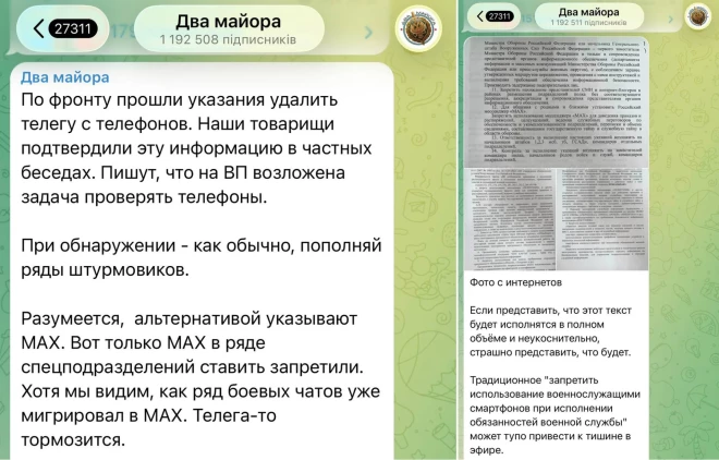 Krievijas Z kanāli ziņo par jaunām Krievijas Ģenerālštāba un Kremļa prasībām, kas varētu negatīvi ietekmēt Krievijas armiju frontē. Pēc viņu teiktā, Maskava pieprasa, lai no viedtālruņiem tiktu izdzēsta ziņojumapmaiņas lietotne un aizstāta ar Krievijas "MAX" lietotni, un tālruņus ir sākts pārbaudīt.